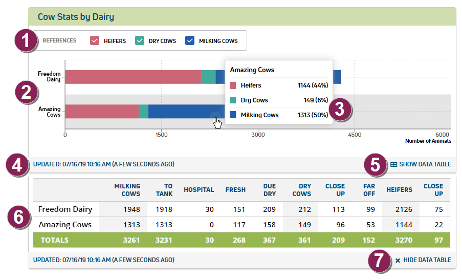 2. Bar graph: Presents animal counts for each company dairy in a colored bar to quickly identify Heifers, Dry Cows, and Milking Cows.