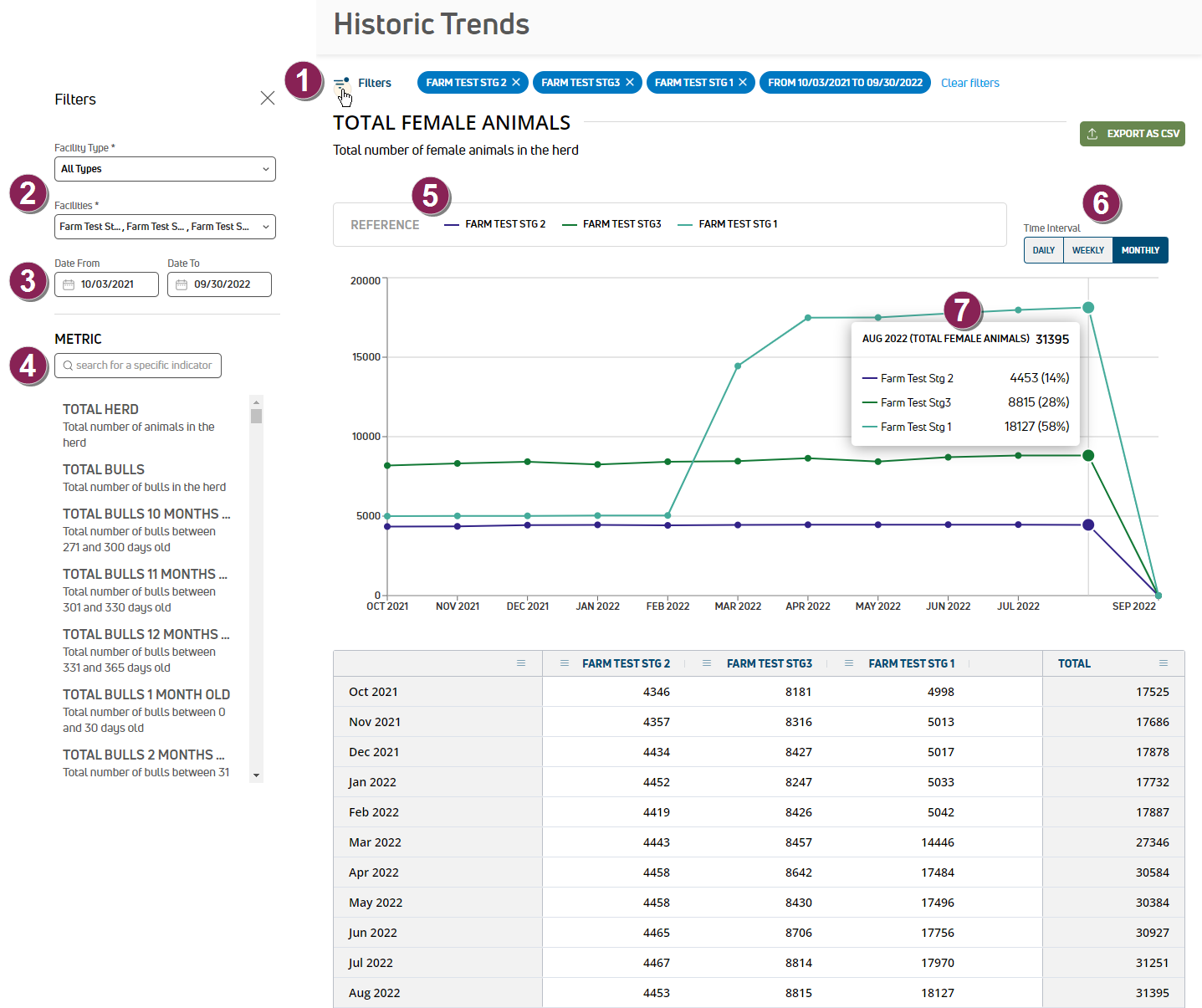 4. Metric filter: Select the specific metric you want to view. There are many metrics to choose from by animal type (female animals, bulls, cows, heifers), ageClosed Age in months, lactation number, health event, herd change, and breed. For example, you can view the number of bulls, the number of metritisClosed Metritis is inflammation of the wall of the uterus, and usually occurs within days of calving. Symptoms of metritis are an enlarged uterus and a foul-smelling uterine discharge. cases, or the number of Holsteins you've had across all dairies in the past month.