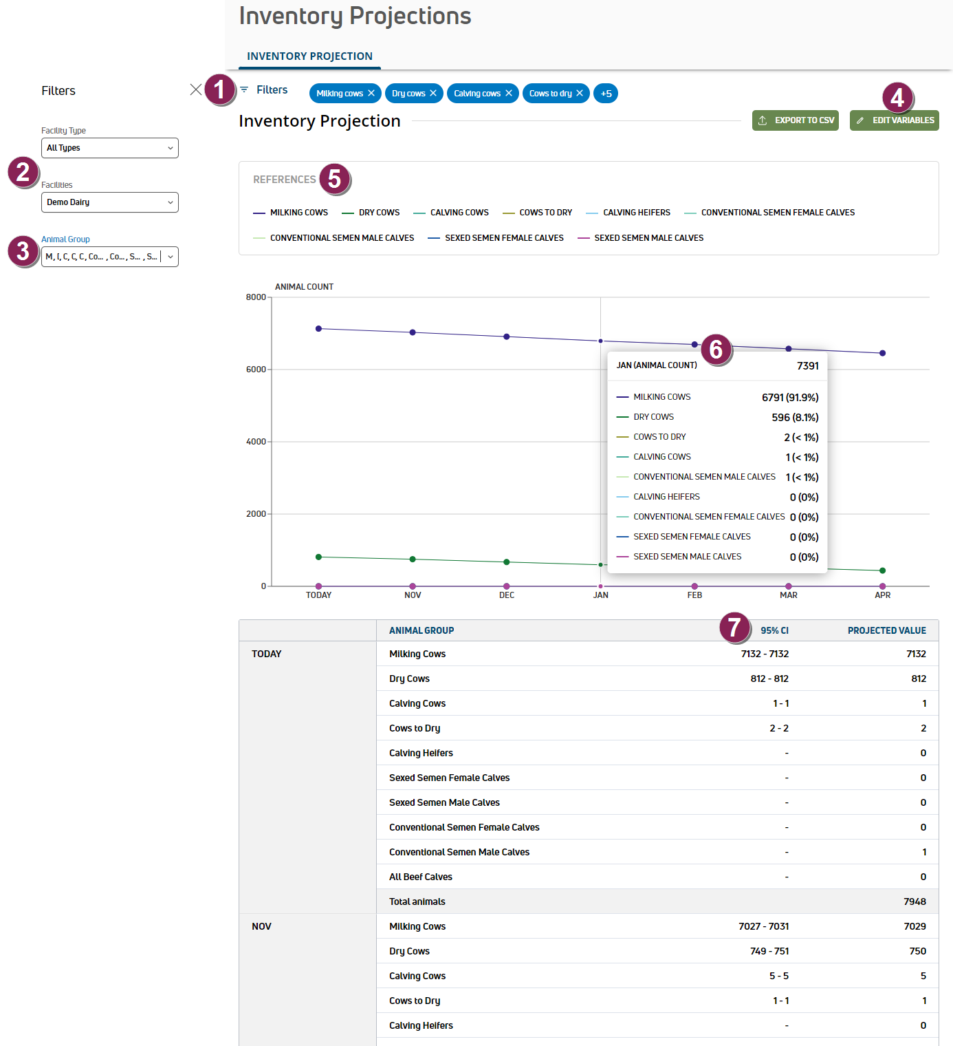 Use the Projections dashboard to view monthly projections of your inventory, including the number of milking cows, dry cows, calves, and more, for the next six months. Use these projections to make well-informed inventory decisions in the future.