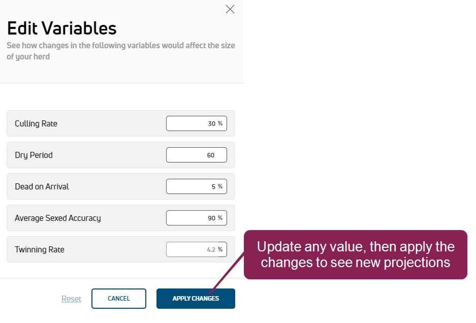 - Edit variables: On the upper right side of the screen, click Edit Variables to change the variable data to see possible outcomes for different scenarios. The system opens a side panel where you can edit Culling Rate, Dry Period, Dead on Arrival, Averaged Sexed Accuracy, and Twinning Rate.