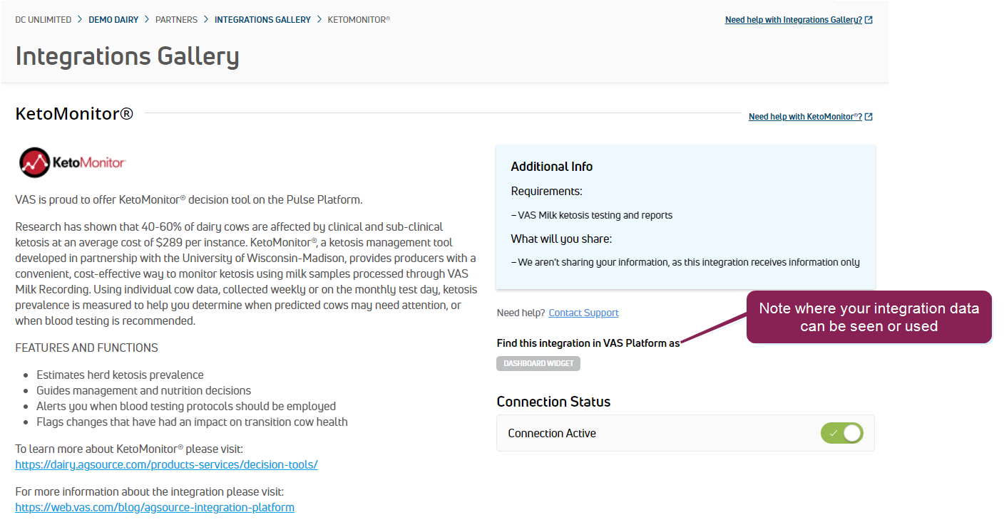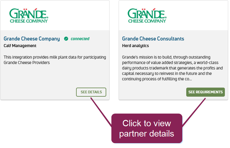 The Partner Integration Details page allows you to view each partner's products or service and how the integration can benefit your dairy. Additionally, it details the technical requirements necessary for the integration.
