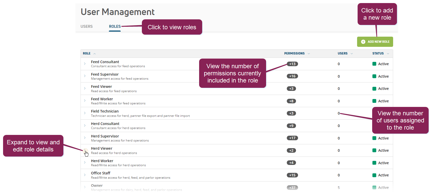 User Management features in PULSE allow you to manage user accounts and roles by company and dairy.
