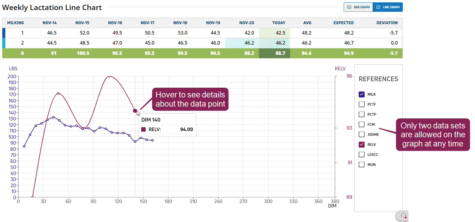 Similar to the graph found on the Lactations page, each point on the milk line represents the average milk weight recorded over the course of a week. Check a box under References to a second line and y-axis to the line graph. Only two data sets are allowed on the graph at any time, and the milk line is always included as a basis of comparison.