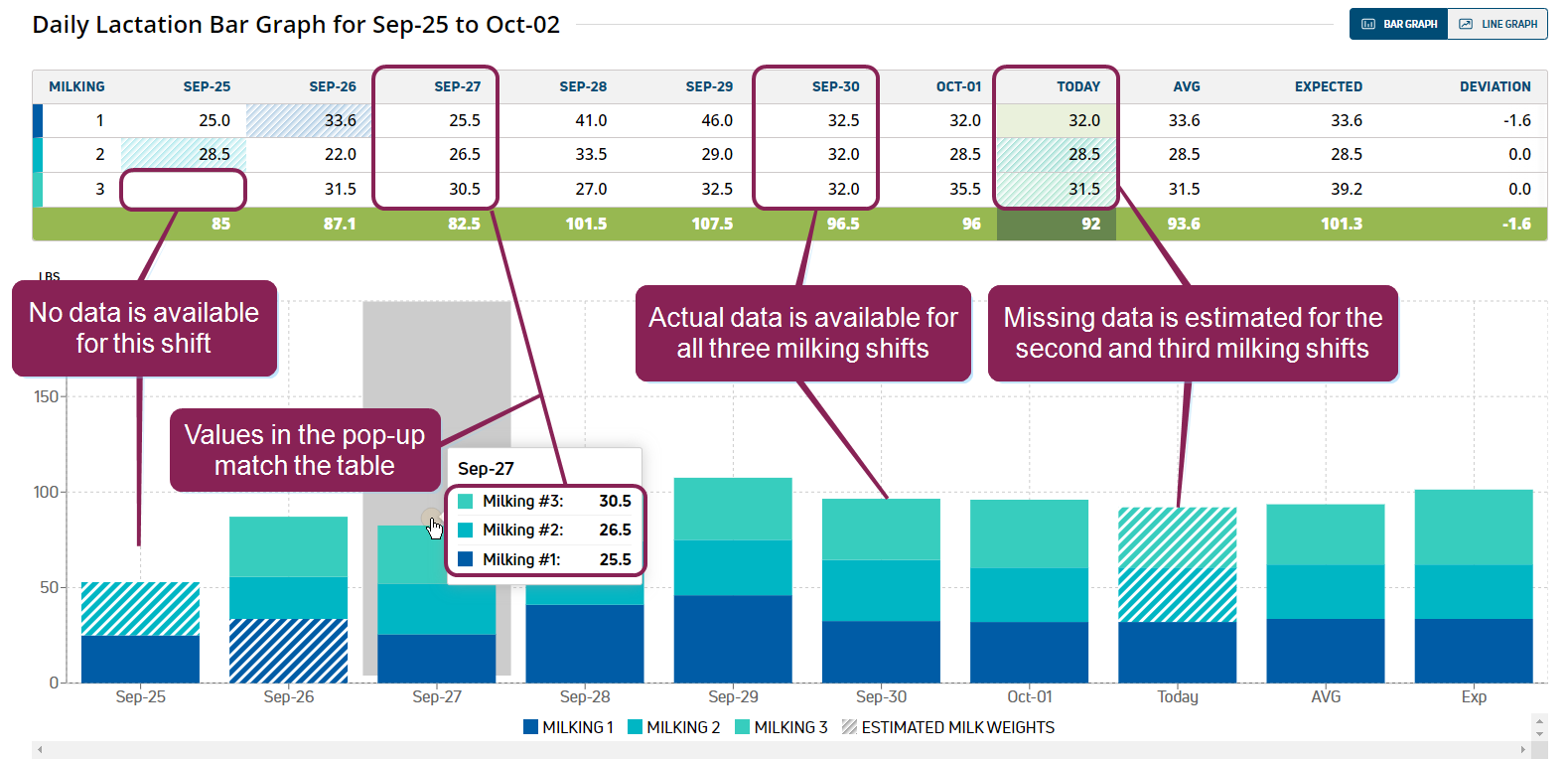 This graph allows you to compare a recorded milk weight against other milkings from the same day and the weights from other days. Hover over a bar on the graph to view additional data.