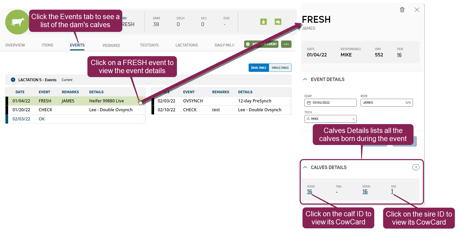 The event details include a list of calves that were delivered during the event. Click any calf's ID to go to its CowCard.
