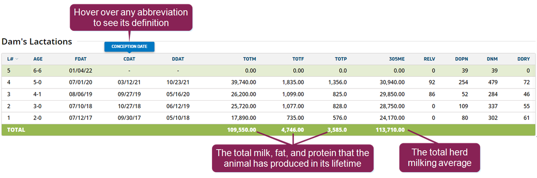 Use the Dam's Lactations table to determine how well the animal's dam performed in each lactation. It contains some of the most important milking-related statistics for each of the animal's lactations, allowing you to gauge its lifetime production rates at a glance.