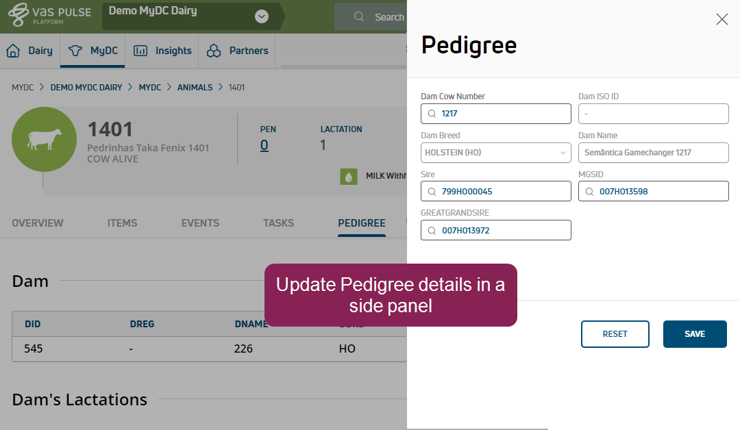 Use the Pedigree tab on the CowCard to learn more about an animal's dam and sire, the dam's lactation history, and offspring information for the animal's calf.