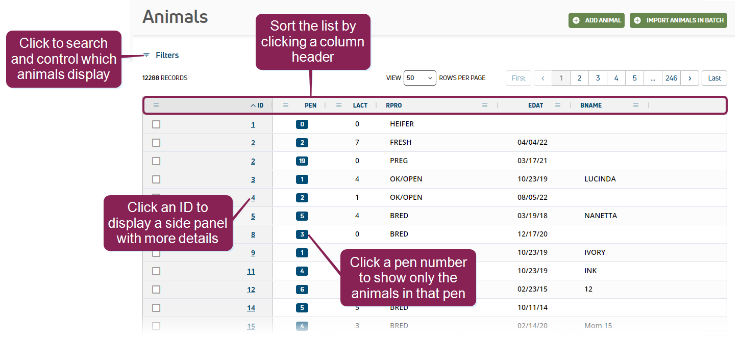 • Animal List: To access the Animal List, select DairyComp/MyDC > Animals > Animal List from the menu bar. Click Filters to search for specific animals or to limit the animals shown by penClosed Pen number, lactation, or reproductive code (RCClosed Reproductive code). You can then sort the Animals table by clicking any of the column headers. If you know the animal's pen number, you can click a Pen option to see only the animals in that pen. When you find the animal you're looking for, click its ID to display a side panel with more details.