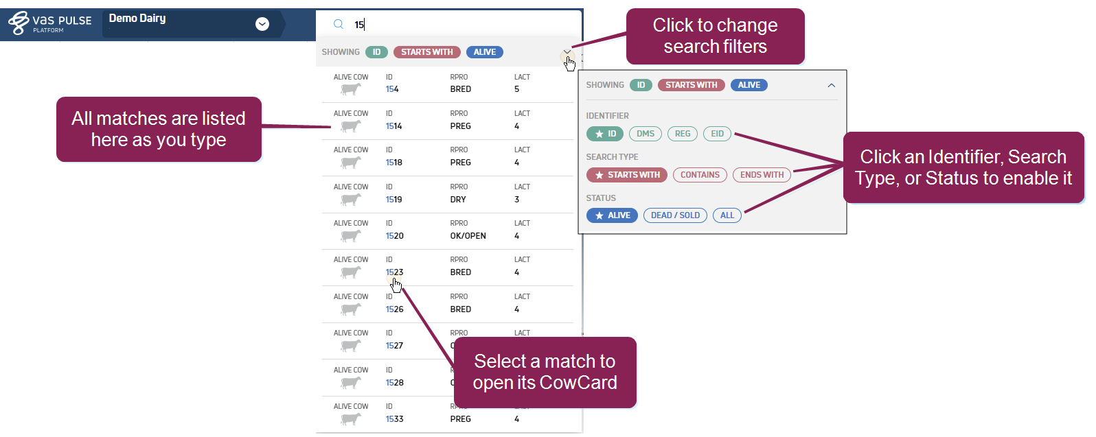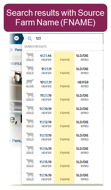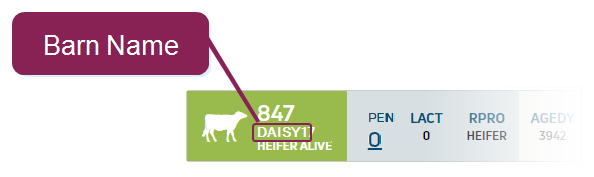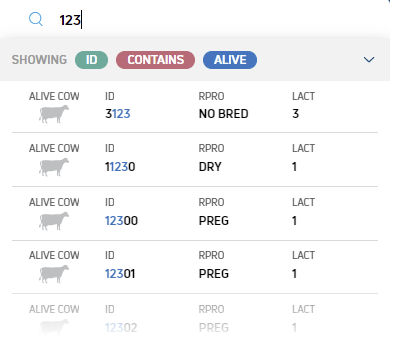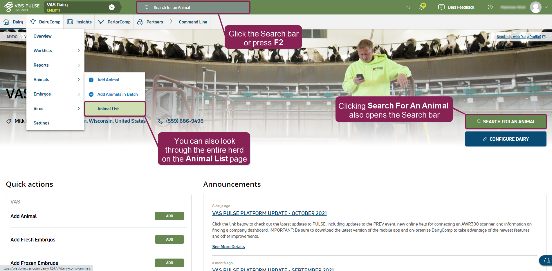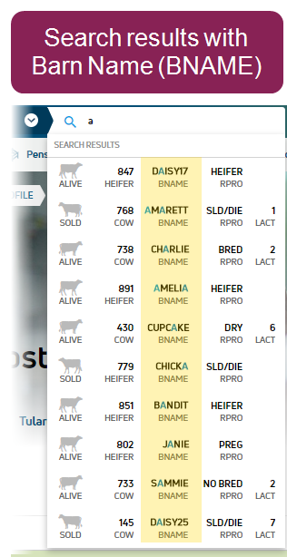 • Search Bar: You can use the Search bar at any time by clicking the Search for an Animal field at the top of the page or pressing F2 on your keyboard. On the Dairy Profile page, you can also click the Search for an Animal button to open the Search bar.