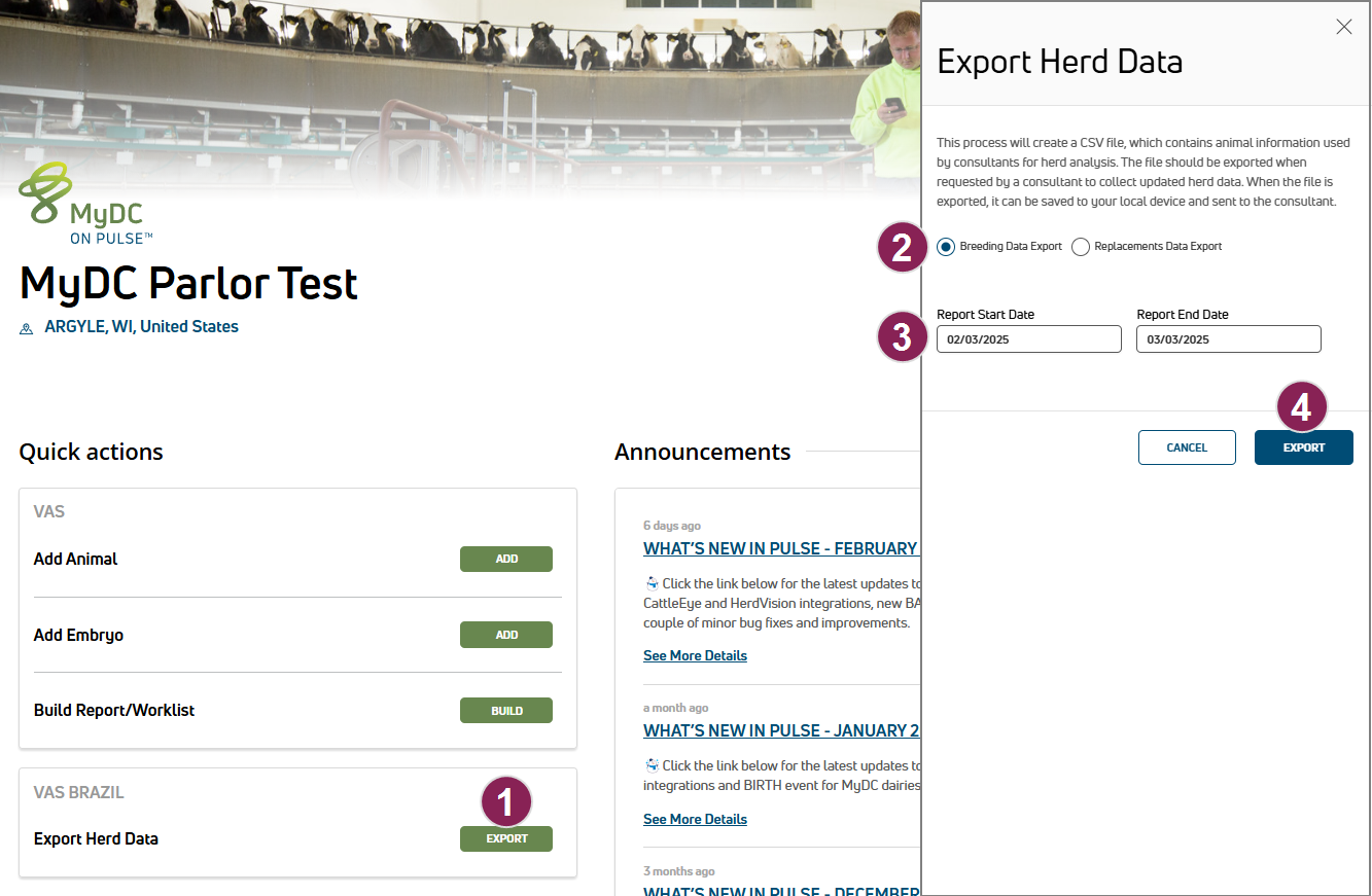 - Click Export at the bottom left side of the page to open the Export Herd Data side panel.