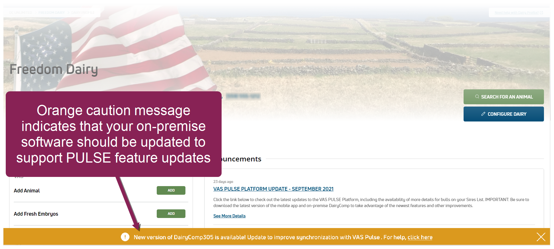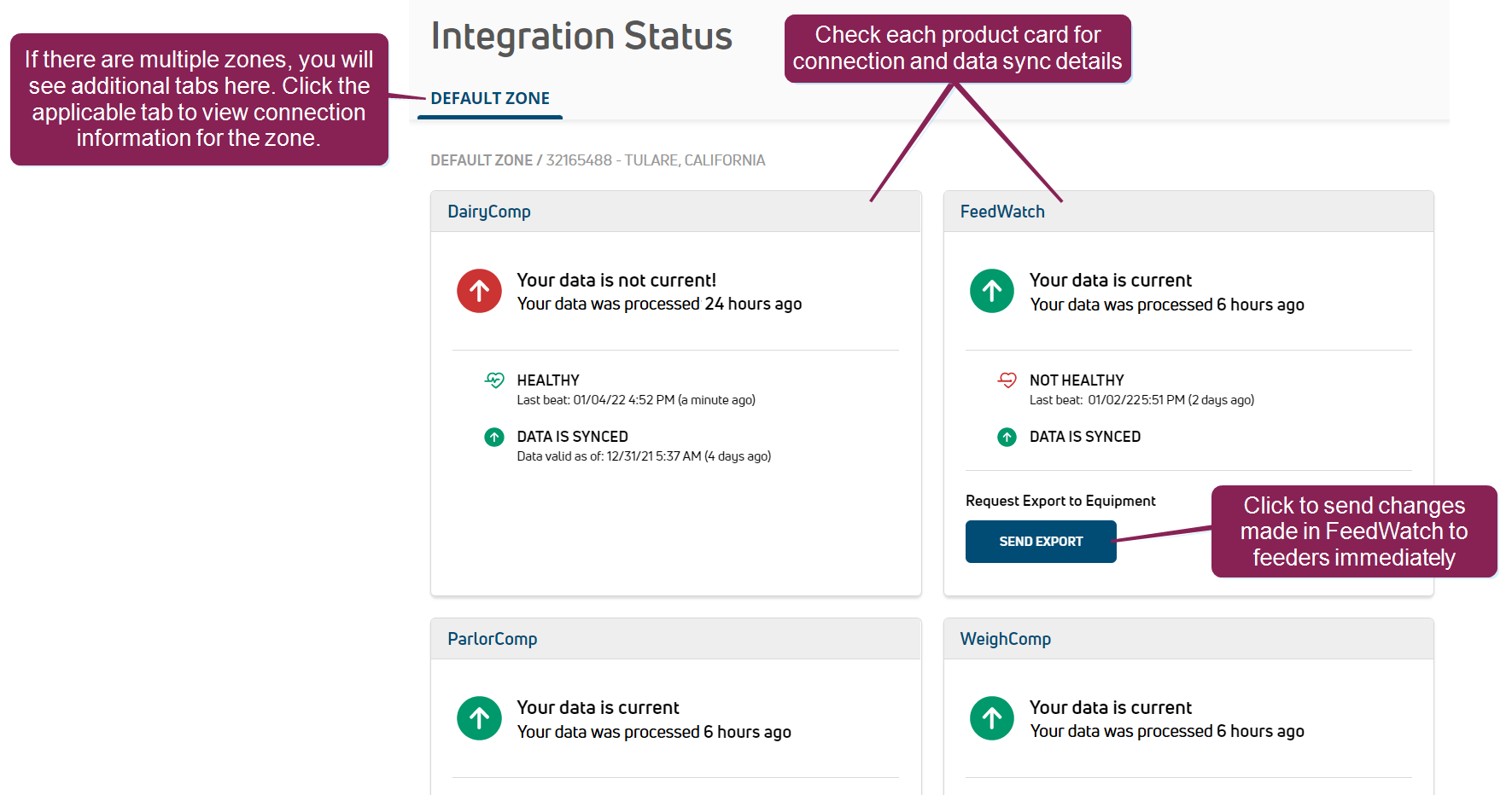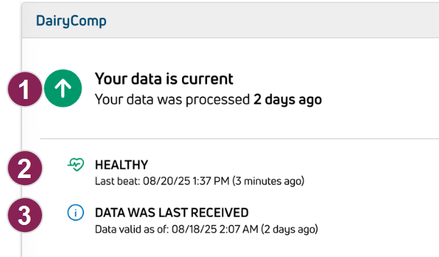 Quickly check the connection status between PULSE and all of your on-premise applications, like DairyComp, on the Integration Status page. Click the Integration Status button at the upper right side to open the page. The button looks different depending upon the integration status: