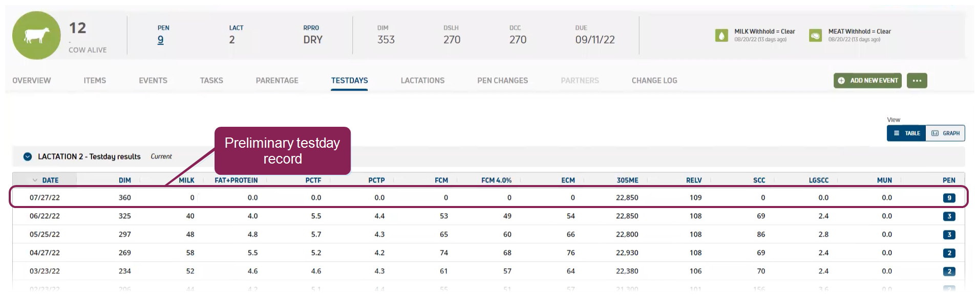 You can also view the preliminary testday record on an animal's CowCard Testdays tab. PULSE shows the results as "0" until the testday samples are processed and your DRPC returns the results.