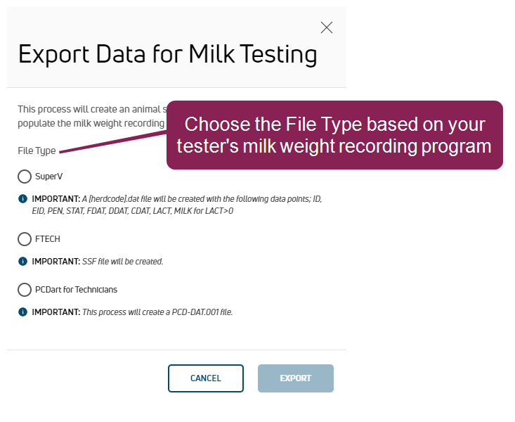 - Select the File Type based on your milk tester's milk weight recording program.