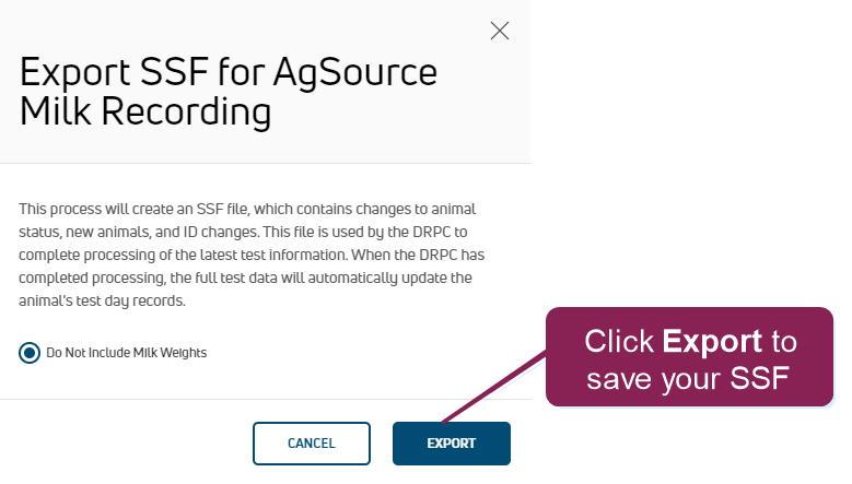 - Depending on the file type selected, the file (DAT, SSF, or PCD-DAT.001 file format) is saved to your local Downloads folder. Provide the file to your milk tester to import into their milk recording program.