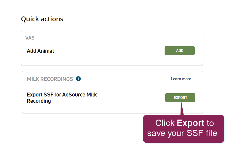 - Go to Quick Actions on your Home (Dairy Profile) page and click Export.