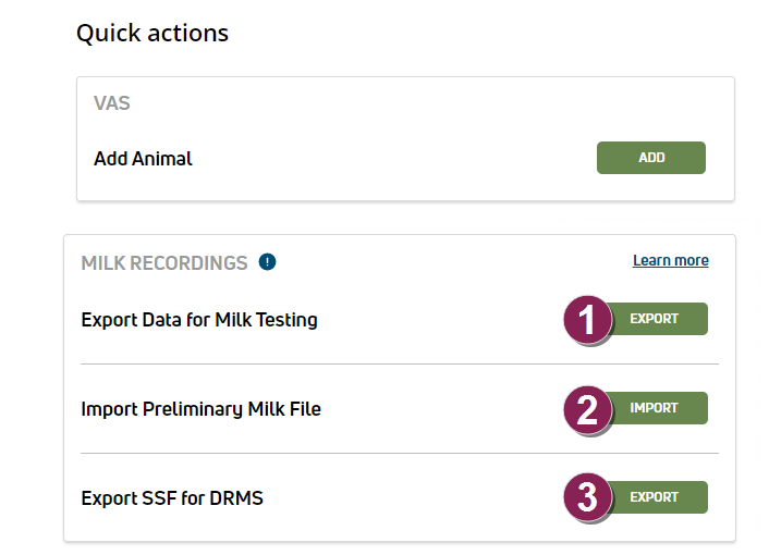 - Go to Quick Actions on your Home (Dairy Profile) page and click Export Data for Milk Testing.