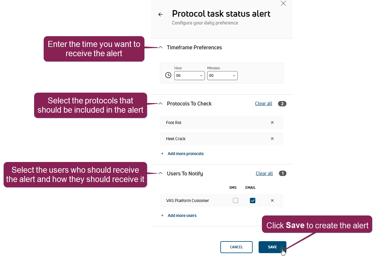 You can receive a daily email or text that provides a quick status update about the day's scheduled processes. For example, you can set up a daily alert that summarizes the progress of your dairy's scheduled protocol tasks. In a short message, the system tells you how many tasks were completed, are overdue, and other details.