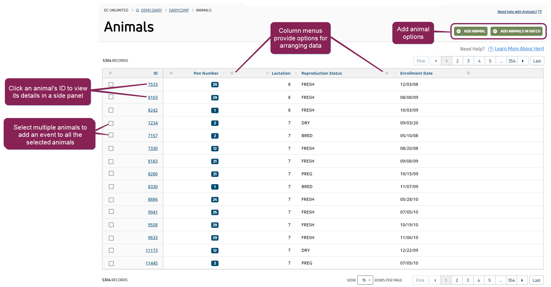 The Animals page lists all of the animals in your dairy. You can view detailed data for each animal, retrieve an animal's CowCard, and add new animals to the herd