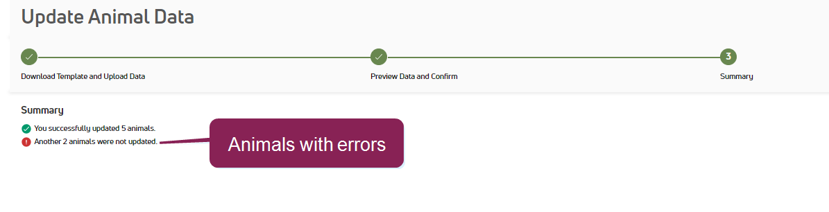 Platform previews the animal data being imported with a summary and, if applicable, errors or warnings. Hover over the error/warning icons to display the full error message.