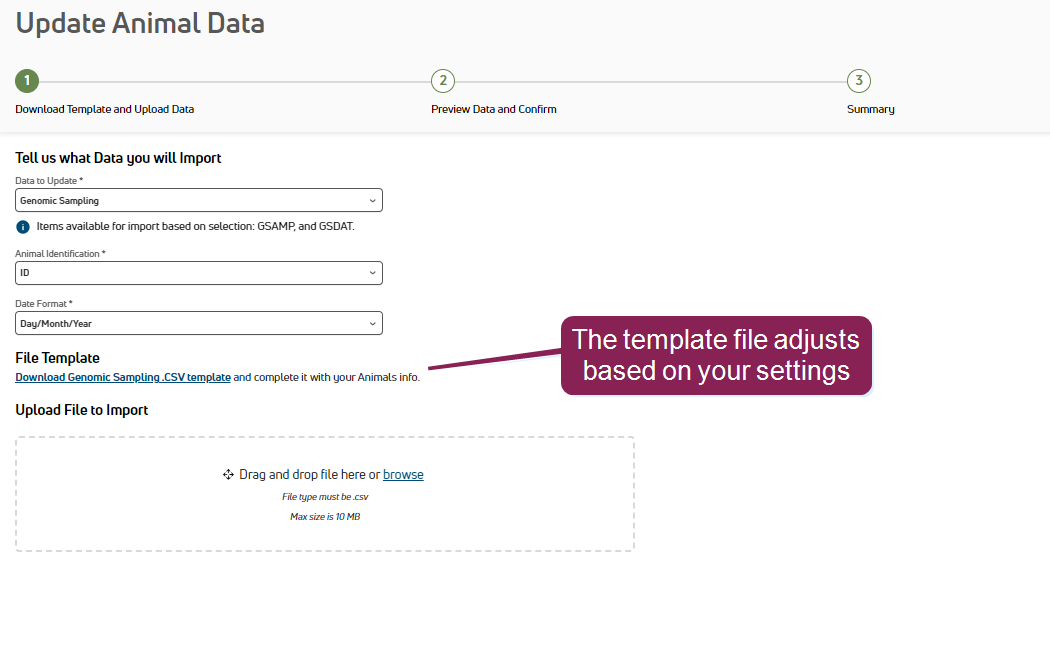 - Genomic Sampling: Upload your genomic sampling data to import your sample data (GSAMP) for a specific date (GSDAT). Both items are required for each animal.