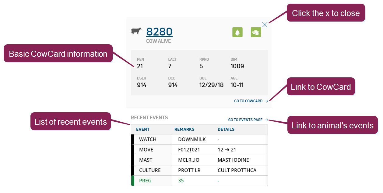 • To view a summary of an animal, click on its ID to open a side panel without leaving the page.