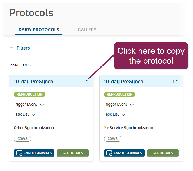 If you'd like to save time and add a protocol similar to an existing one, go to the Dairy Protocols page and click the copy button
