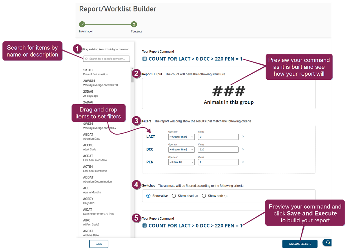 5. Click Save and Execute to build your report and display the results of the report on the Reports/Worklists Results page. DC Unlimited subscribers can also preview the command as the report is being built.