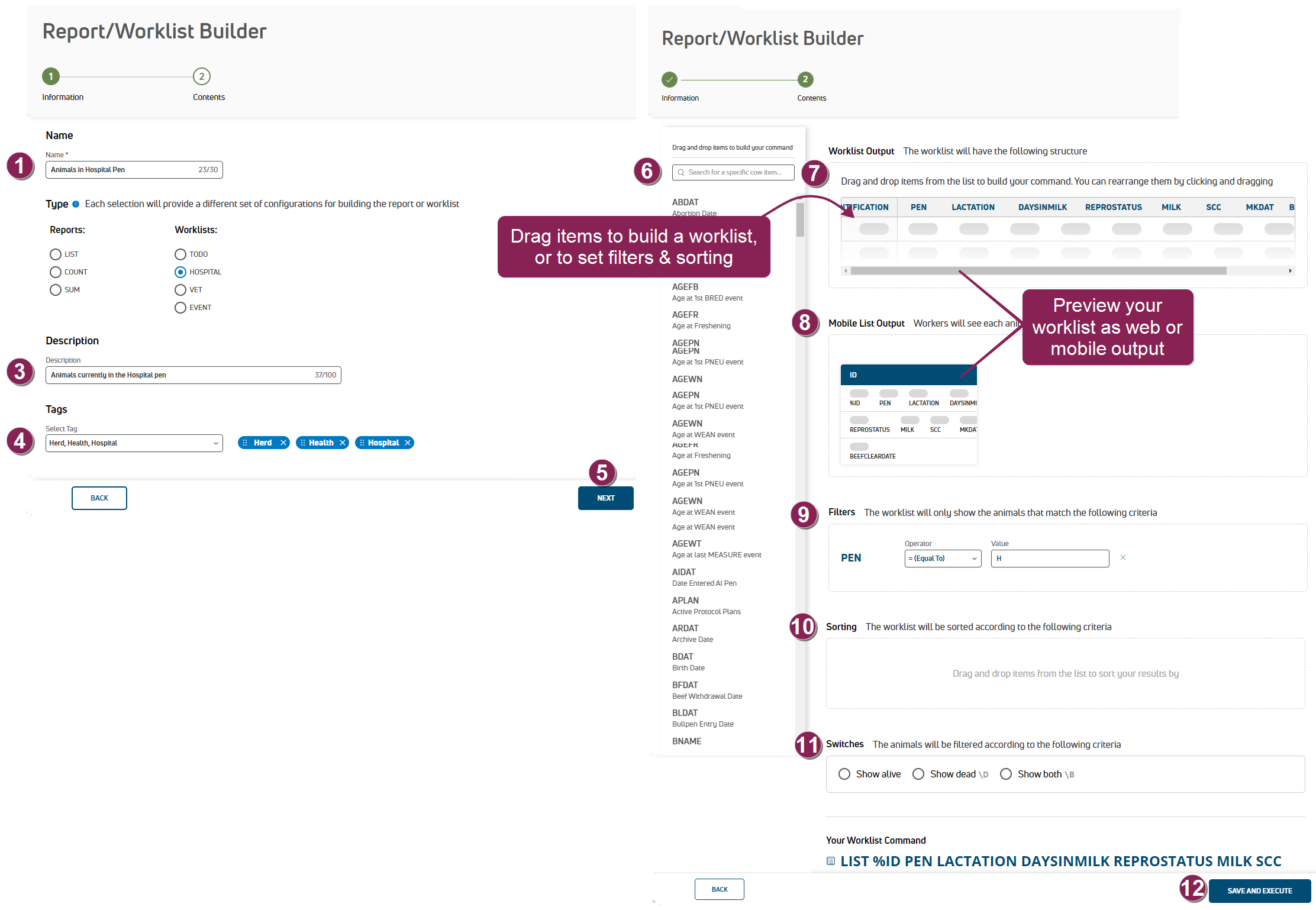 Begin by selecting Build Report/WorklistClosed A worklist is a structured list of tasks or animals requiring attention, typically used to organize and prioritize work. In PULSE and the mobile app, worklists identify animals that need to be seen by dairy workers or animal health experts for specific reasons, such as pregnancy checks or treatment in a hospital pen. option from the DairyComp/MyDC menu, clicking the button at the top of the Dairy Reports/Worklists page, or clicking Customize from the Template Gallery page. Then use the two-step Report/Worklist Builder to create or edit your Hospital List.