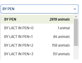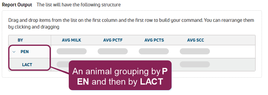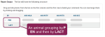 For example, if you drag and drop the PENClosed Pen number item and then drag and drop the LACTClosed Lactation number item beneath it, an animal grouping is created by pen and then by lactation.