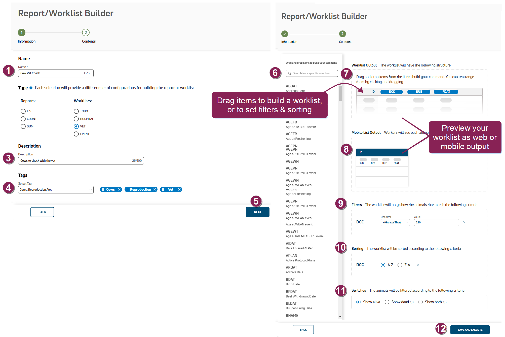 Begin by selecting Build Report/WorklistClosed A worklist is a structured list of tasks or animals requiring attention, typically used to organize and prioritize work. In PULSE and the mobile app, worklists identify animals that need to be seen by dairy workers or animal health experts for specific reasons, such as pregnancy checks or treatment in a hospital pen. option from the DairyComp/MyDC menu, clicking the button at the top of the Dairy Reports/Worklists page, or clicking Customize from the Template Gallery page. Then use the two-step Report/Worklist Builder to create or edit your Vet List.