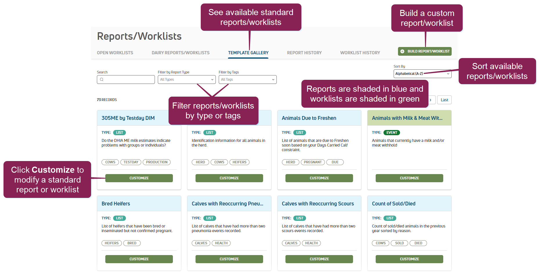A worklist is a structured list of tasks or animals requiring attention, typically used to organize and prioritize work. In PULSE and the mobile app, worklists identify animals that need to be seen by dairy workers or animal health experts for specific reasons, such as pregnancy checks or treatment in a hospital pen.s that are available for your dairy within PULSE. Note that reports are shaded in blue and worklists are shaded in green.