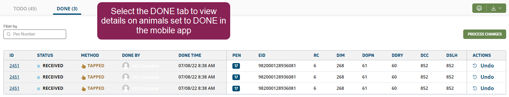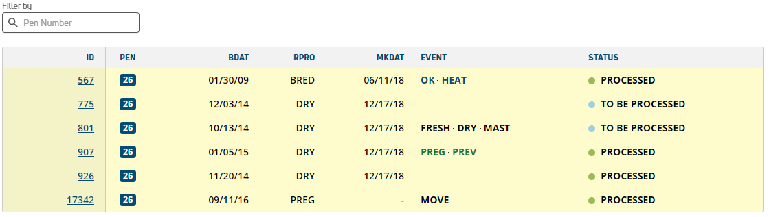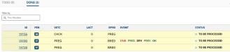 - PROCESSING: If an animal's status is PROCESSING, either you or another PULSE user has set it to DONE and then tapped the Process Changes button to send the updates back to on‑premise. As a visual cue, animals in this state are displayed with a light blue bar to the right (see example below).