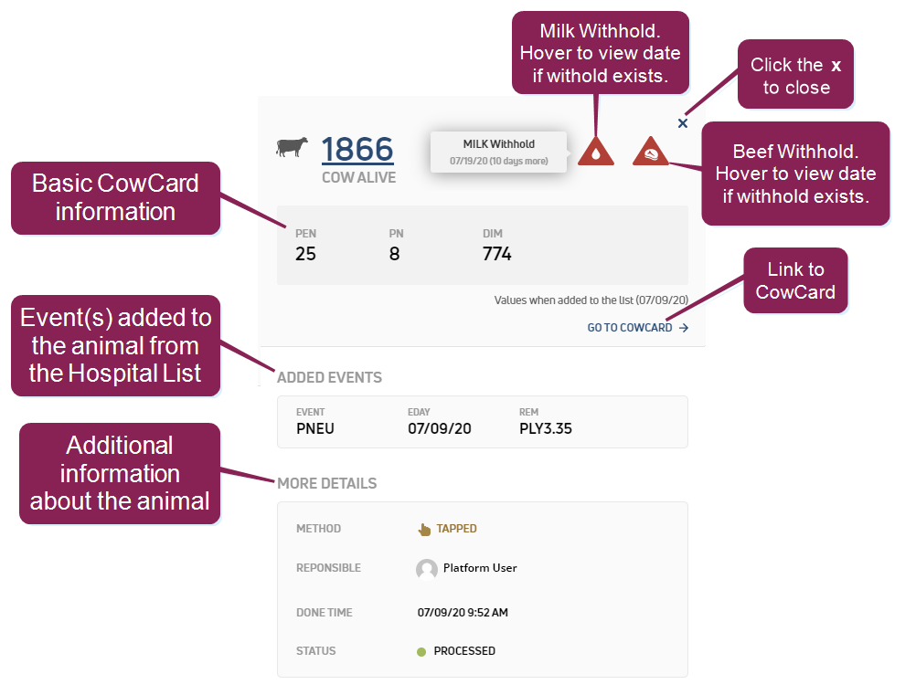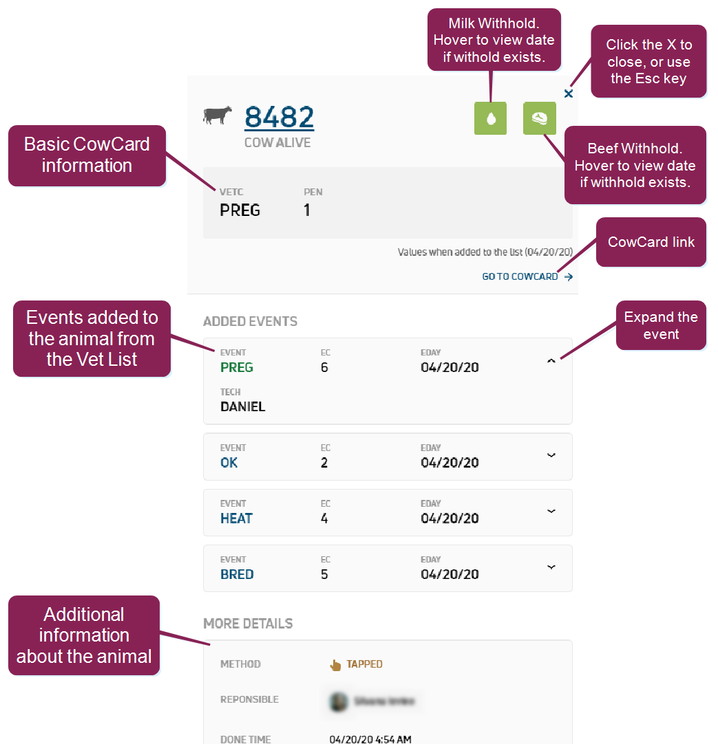 - Basic CowCard information appears near the top of the panel (animal status, lactation number, age
