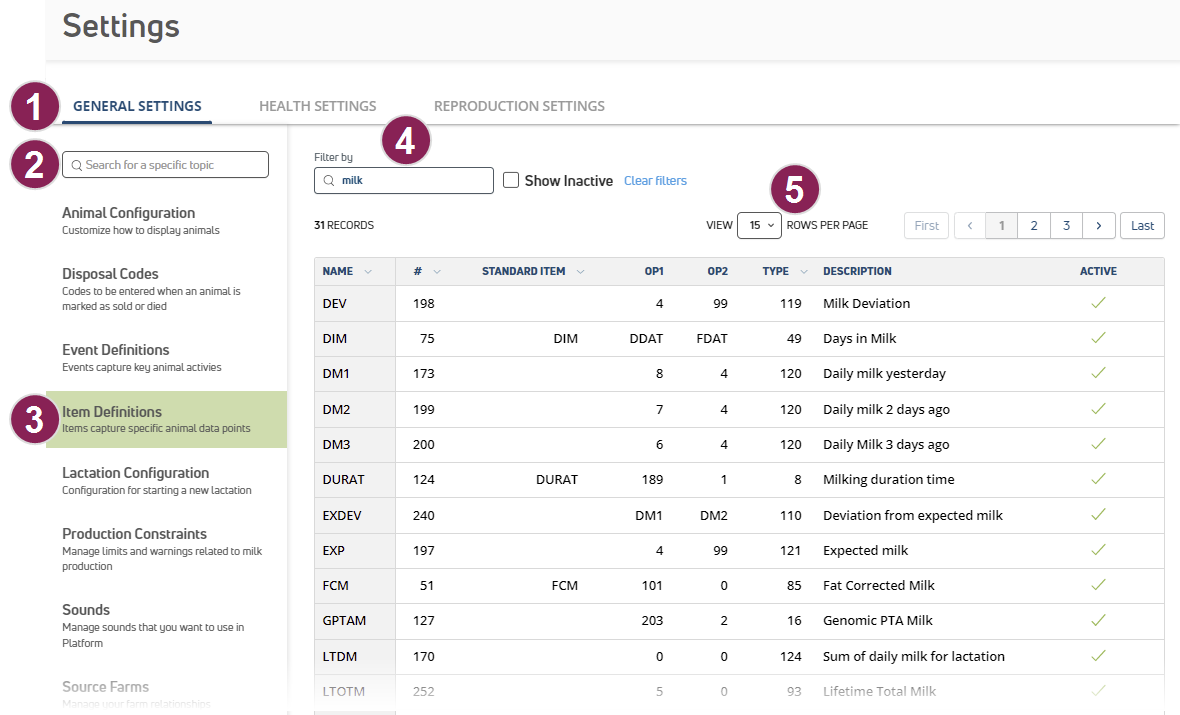 1. View Settings Categories: Click the tabs at the top of the page to view General Settings, Health Settings, and Reproduction Settings.