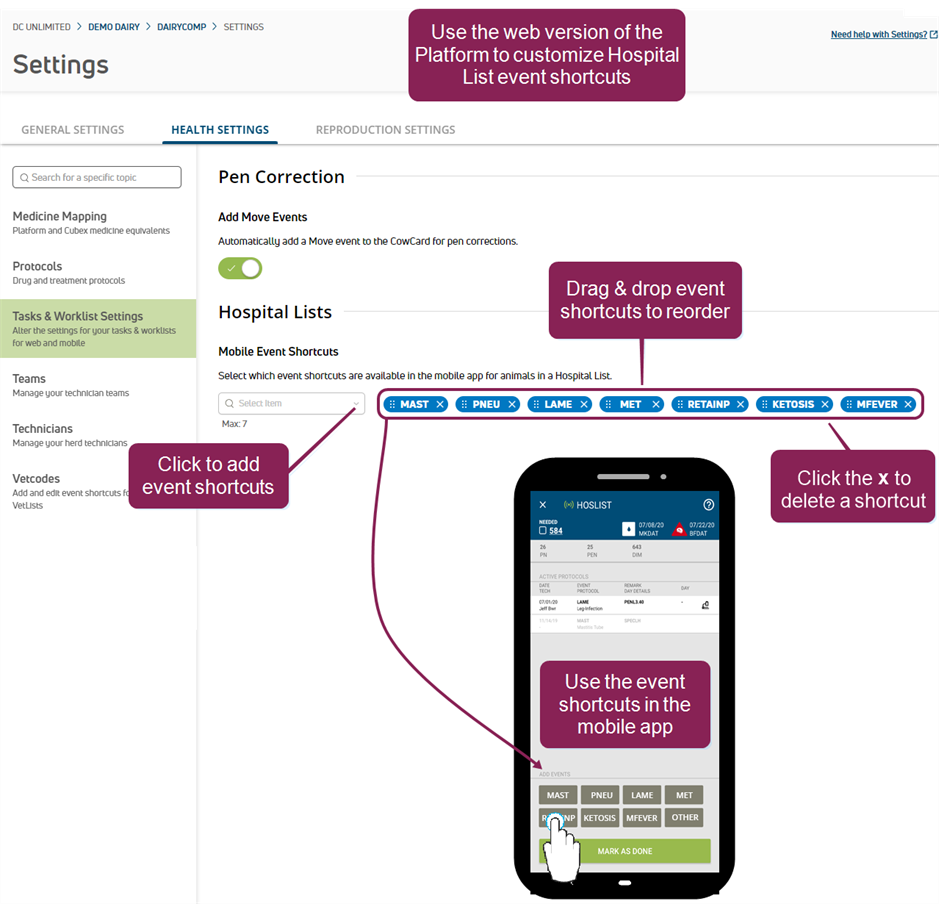 A worklist is a structured list of tasks or animals requiring attention, typically used to organize and prioritize work. In PULSE and the mobile app, worklists identify animals that need to be seen by dairy workers or animal health experts for specific reasons, such as pregnancy checks or treatment in a hospital pen. Settings page allows you to: