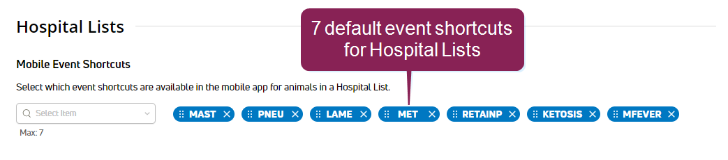 To add new event shortcuts to your hospital lists, and if 7 event shortcuts are already selected, you must first click the x on an event shortcut to delete it and free up space for a new event shortcut. Then, use the drop‑down list to select the new event that your hospital team needs while treating animals.
