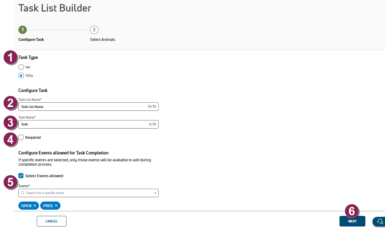 - Select Events allowed (ToDo only): If you want to make event selection faster when you create a ToDo task list, you can limit the events that can be added to an animal upon task completion. Check the Select Events allowed box and select the events from the drop-down list.