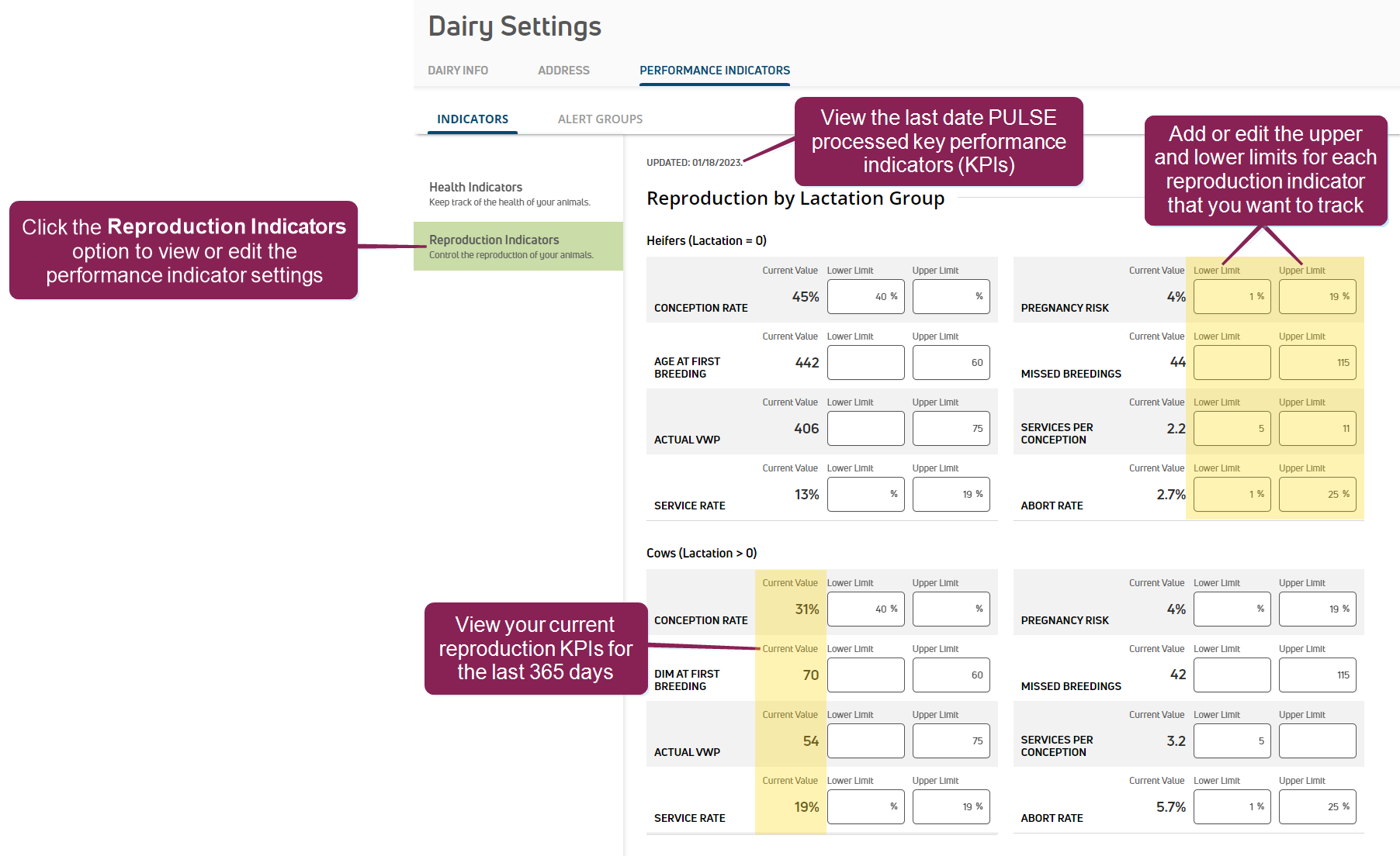 PULSE does not currently support alerts and notifications for reproduction indicators. However, you'll see the reproduction indicators you're currently tracking on the Reproduction Insights report, which tracks cow and heifer reproduction across your herd.