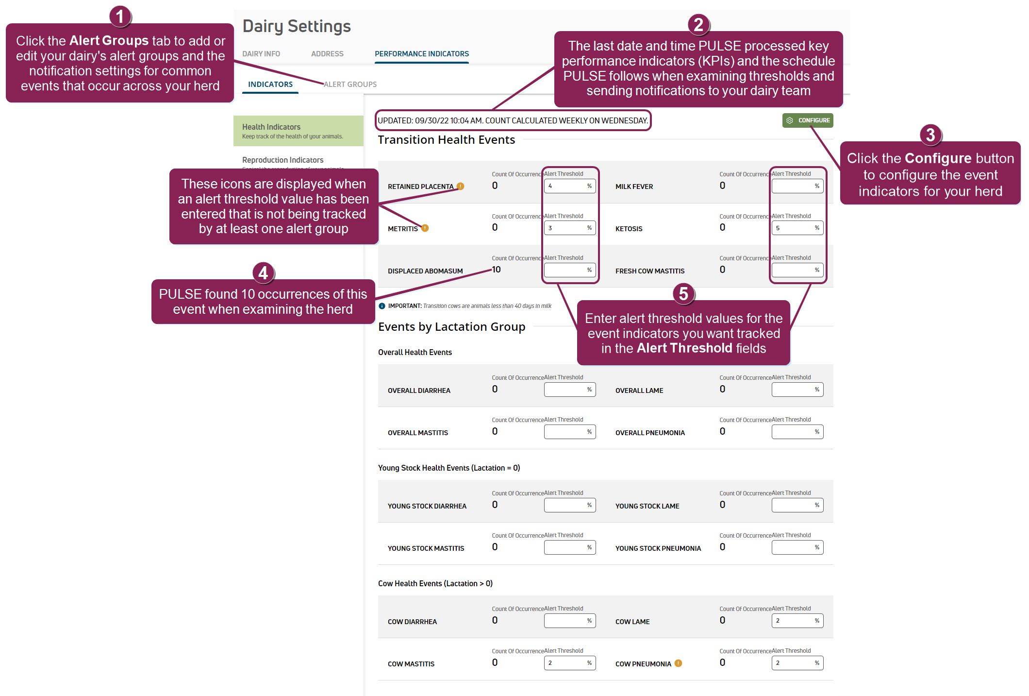 Key Performance Indicator's were last updated by PULSE and the schedule PULSE follows when examining thresholds. - Click the Configure button to open a side panel and enable alerts and thresholds for your herd. See Step 1: Enable & Set Up Health Indicators for instructions.