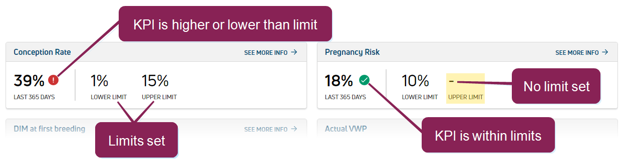 KPI is within the limit(s) currently being tracked. When you track an upper and lower limit for a reproduction KPI, the current value must be within the range of both limits to see the |
