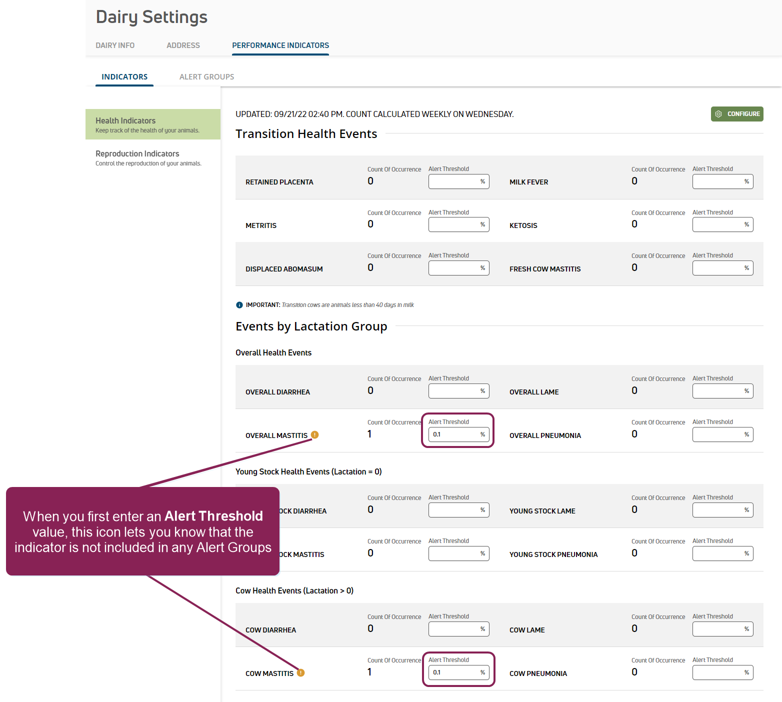 NOTE: The alert threshold values entered on the Indicators page in Dairy Settings are different from the Threshold (%) values entered when configuring events. See Edit Event Definitions for more information.Once the indicators are included in at least alert group on the Alert Groups page, the icons in the example above are no longer displayed.