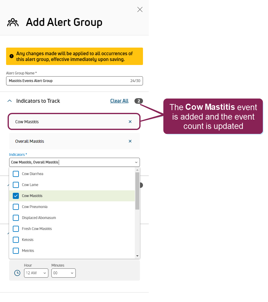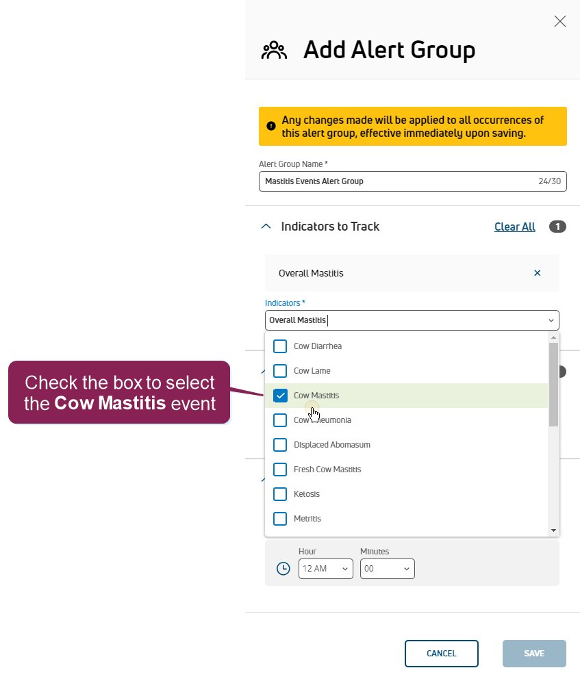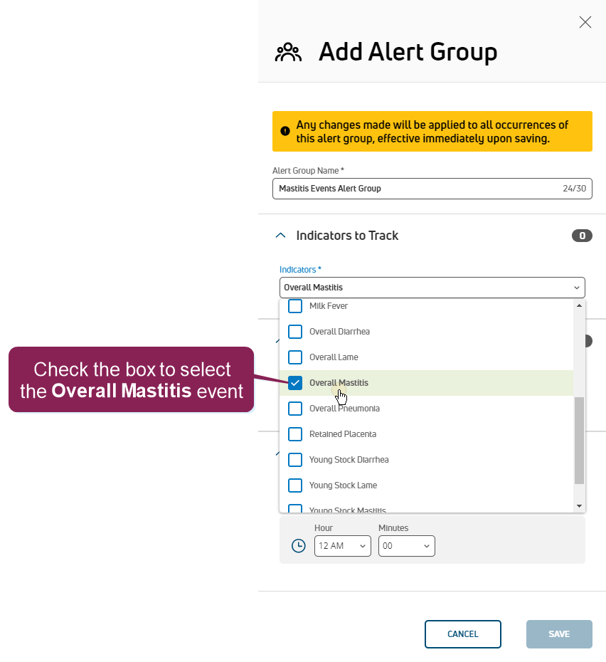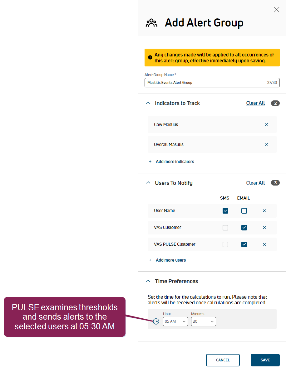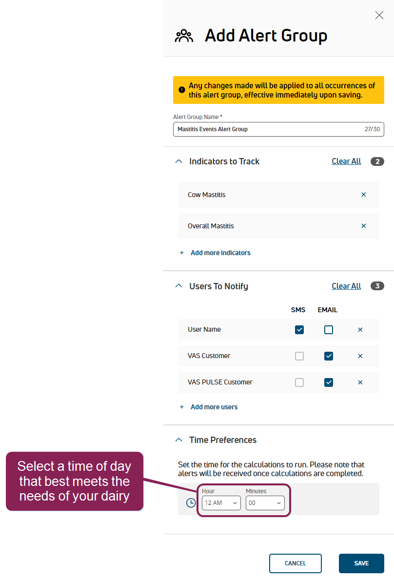 NOTE: The time specified here combines with the period selected in the Period Preferences area in Step 1: Enable & Set Up Health Indicators, and these settings determine how often PULSE examines thresholds and notifies your dairy team. At the time specified, PULSE examines the thresholds for your dairy first and then alerts your dairy team after processing completes. Depending on the size of your dairy and the number of event indicators being tracked by this alert group, alerts may not be sent or received exactly at the time specified.