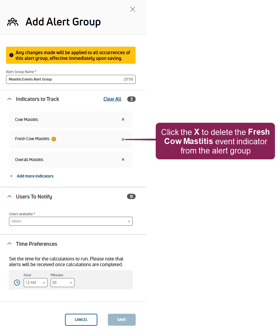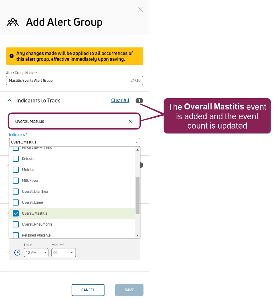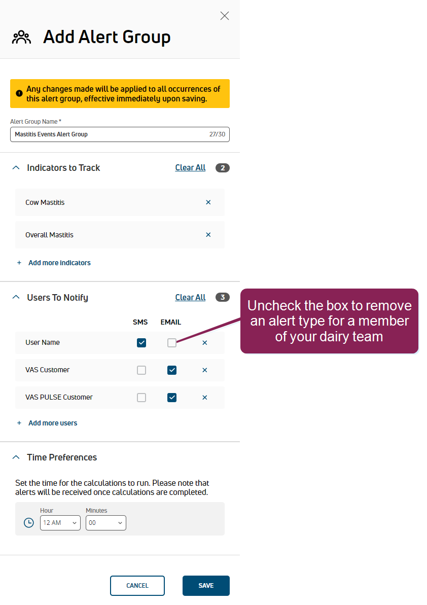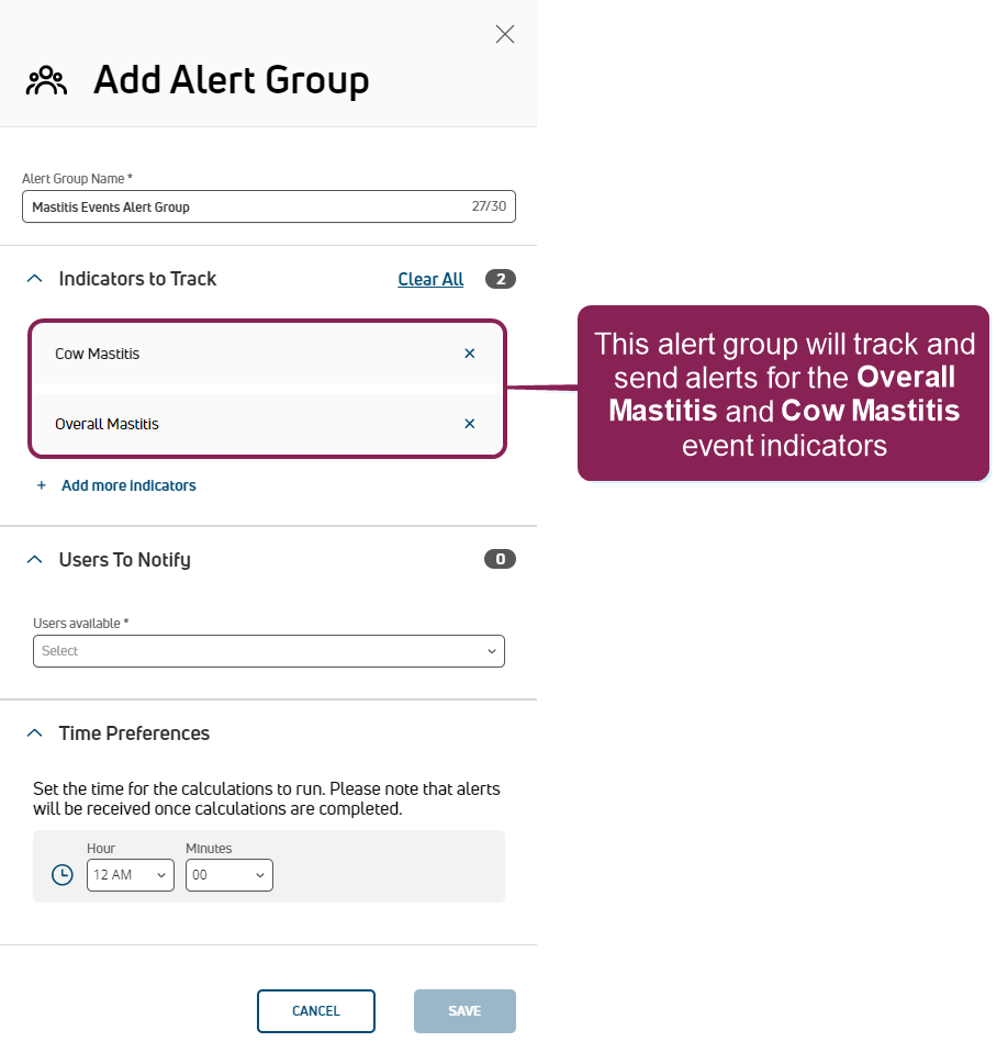 NOTE: The time specified here combines with the period selected in the Period Preferences area in Step 1: Enable & Set Up Health Indicators, and these settings determine how often PULSE examines thresholds and notifies your dairy team. At the time specified, PULSE examines the thresholds for your dairy first and then alerts your dairy team after processing completes. Depending on the size of your dairy and the number of event indicators being tracked by this alert group, alerts may not be sent or received exactly at the time specified.