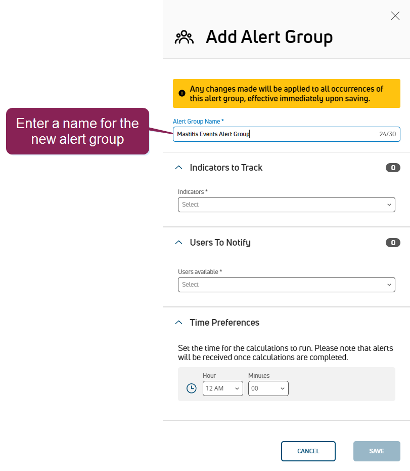 3. Enter an Alert Group Name for the alert group. For example, since we entered an alert threshold value for the Overall MastitisClosed Mastitis is the persistent, inflammatory reaction of the udder tissue due to physical trauma or infection. Symptoms of mastitis include udder swelling, heat, hardness, redness, or pain. The milk may have a watery appearance, flakes, clots, or pus. and Cow Mastitis events in Step 2: Enter Alert Thresholds, we'll enter an alert group name of "Mastitis Events Alert Group" here.