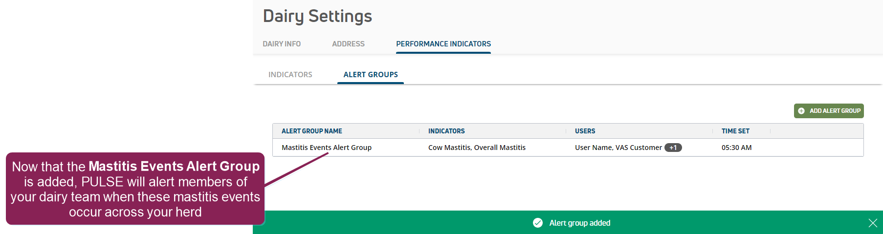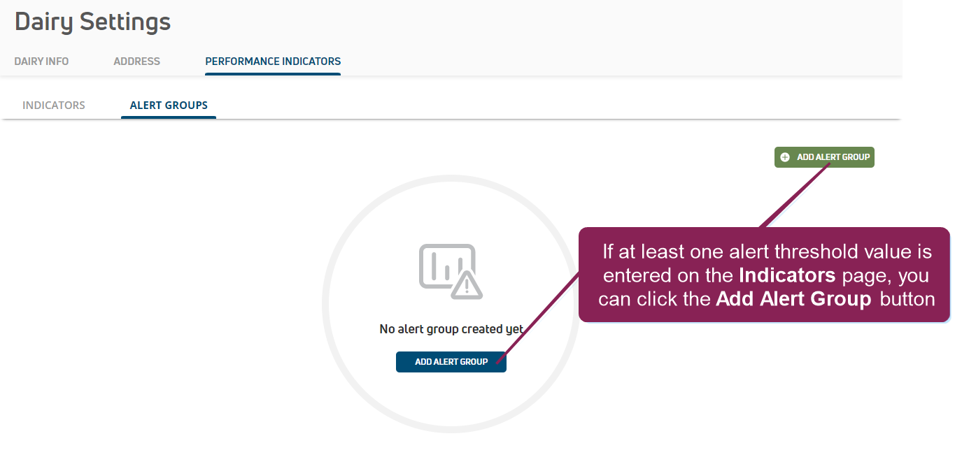 You cannot add or edit alert groups until alerts and thresholds are enabled in PULSE and at least one alert threshold value is entered on the Indicators page for your herd.