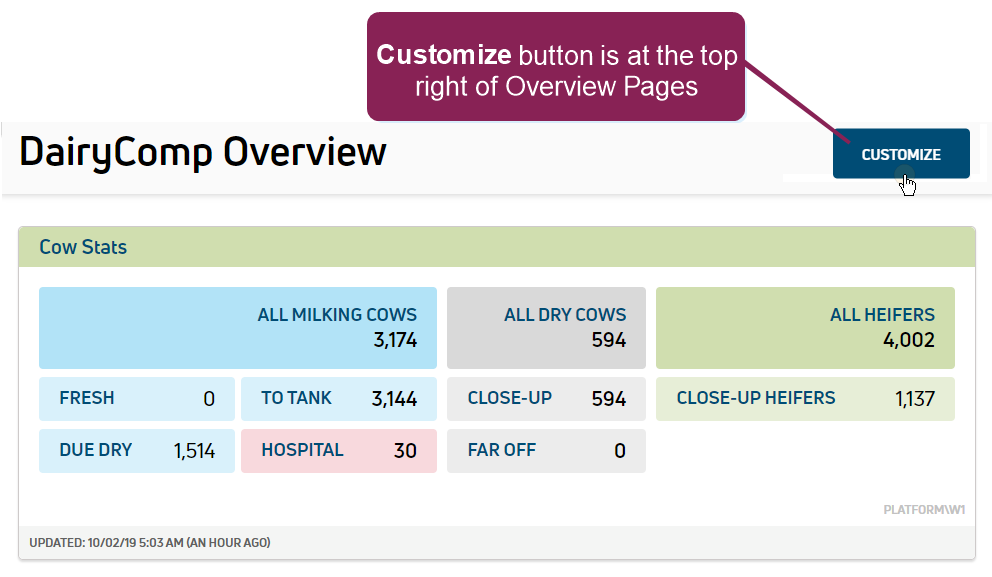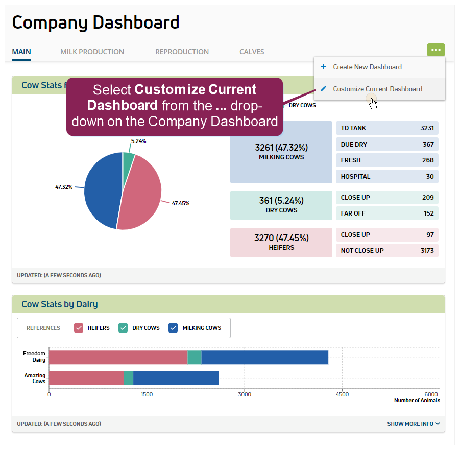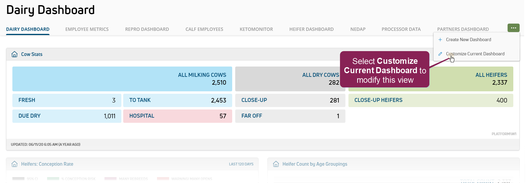 Customize Current Dashboard option at the top right of the Dairy or Company Dashboard or the Customize option on Overview pages to personalize your dashboards.