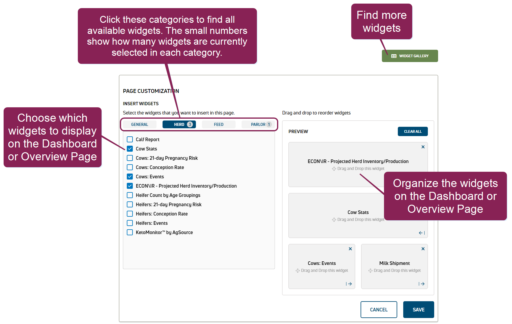 - The widgets are categorized under the following tabs: General, Herd, Feed, and Parlor. Click each tab to view the widgets that are available in these categories. See Widget Descriptions for more information.