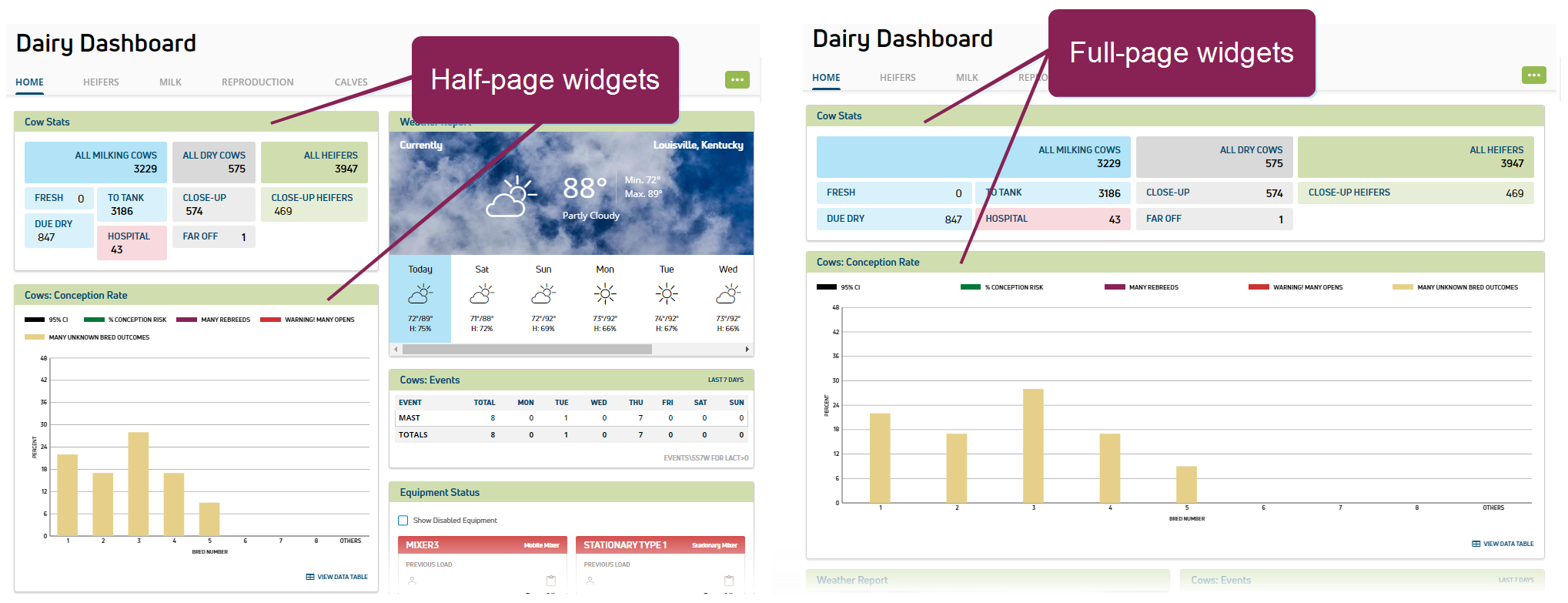 You can customize your dashboards based on the needs of your dairy. You can add, remove, resize, or rearrange widgets to prioritize the data you see. (For a full list of available widgets and what they show, see Widget Descriptions.)