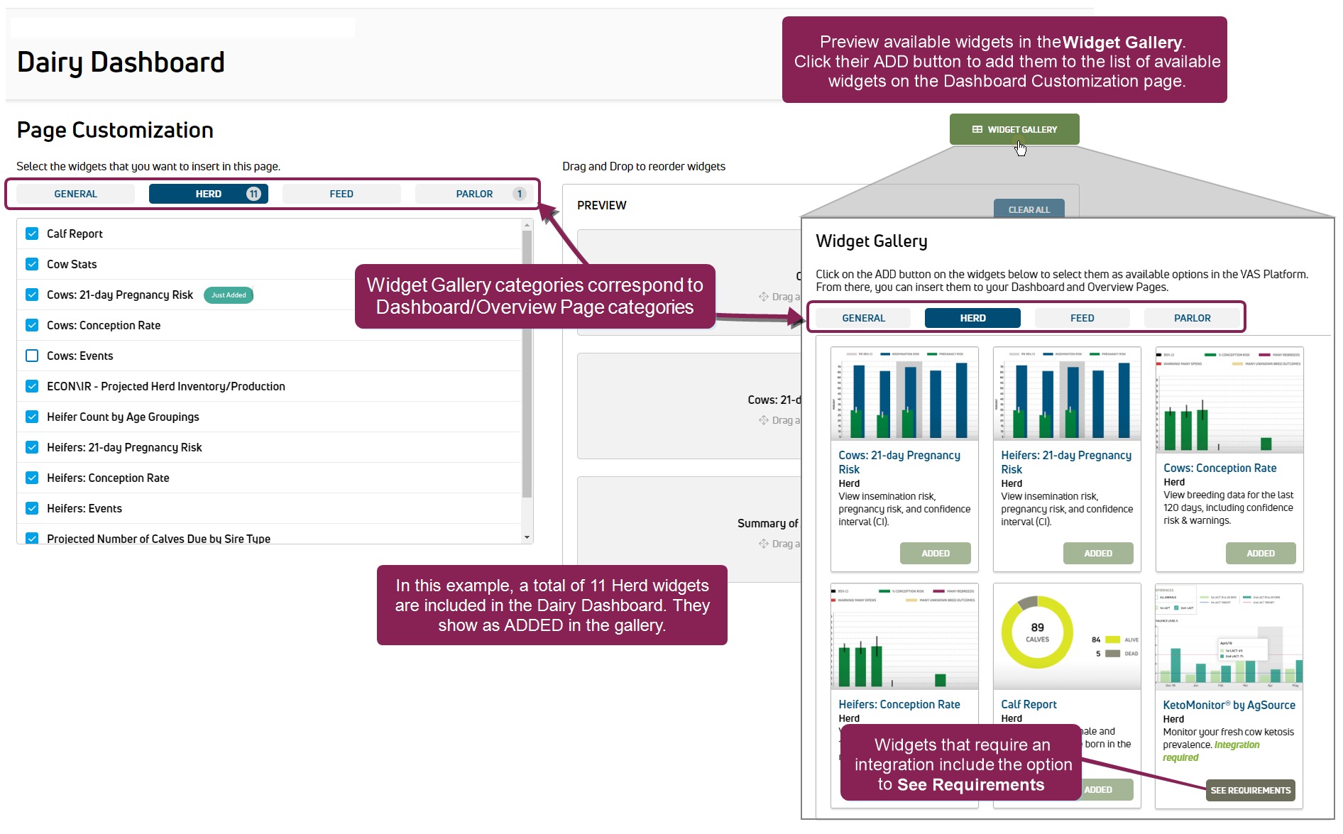 In the example, 11 Herd widgets are included in the Dairy Dashboard, each of which shows as ADDED in the Widget Gallery.