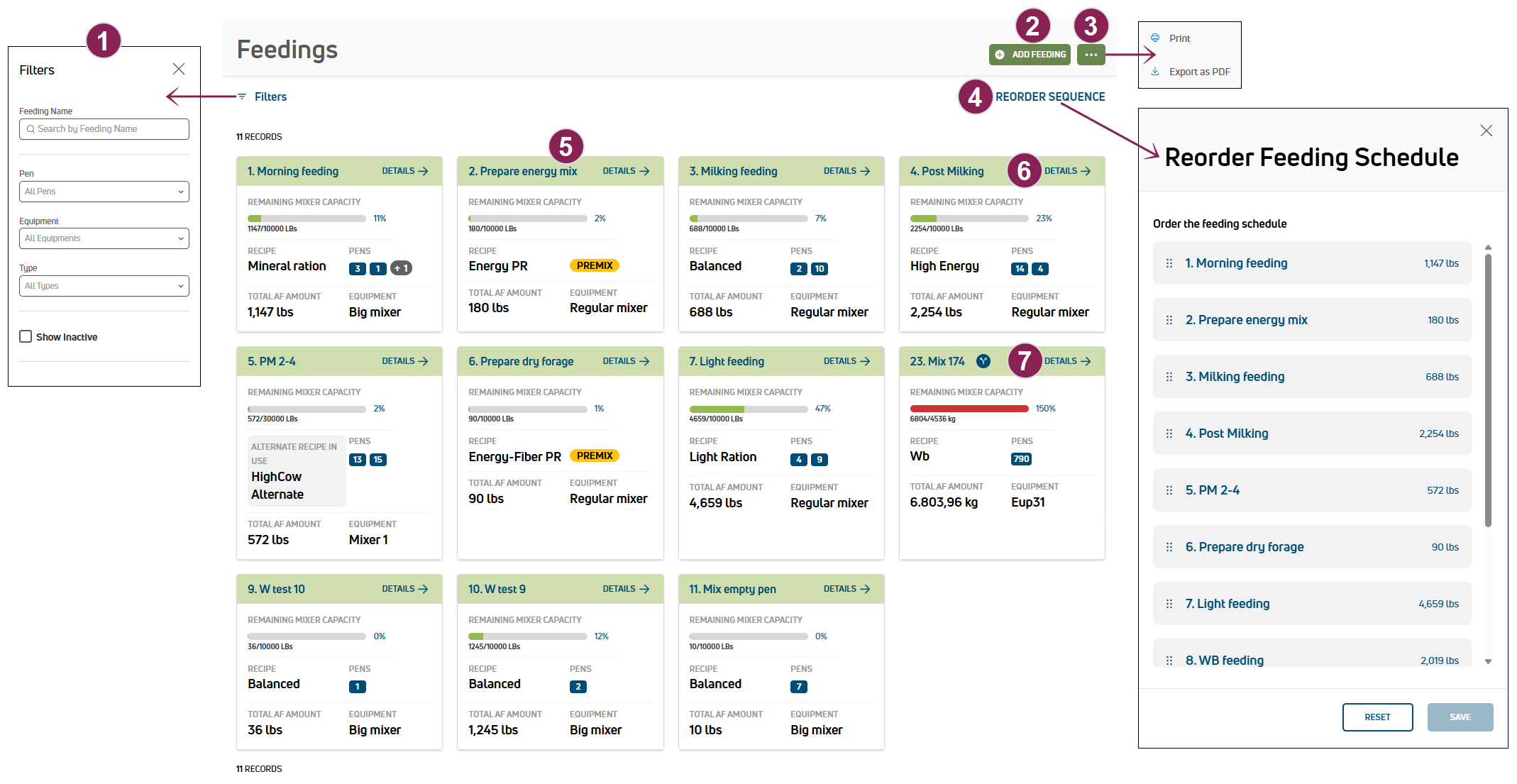 Use this page to create, adjust, and maintain the feedings included in your dairy’s feeding schedule. All of your dairy’s current feedings are listed on the page. The feeder will generally follow the order displayed, moving left to right and top to bottom. Expand the sections below to learn more:
